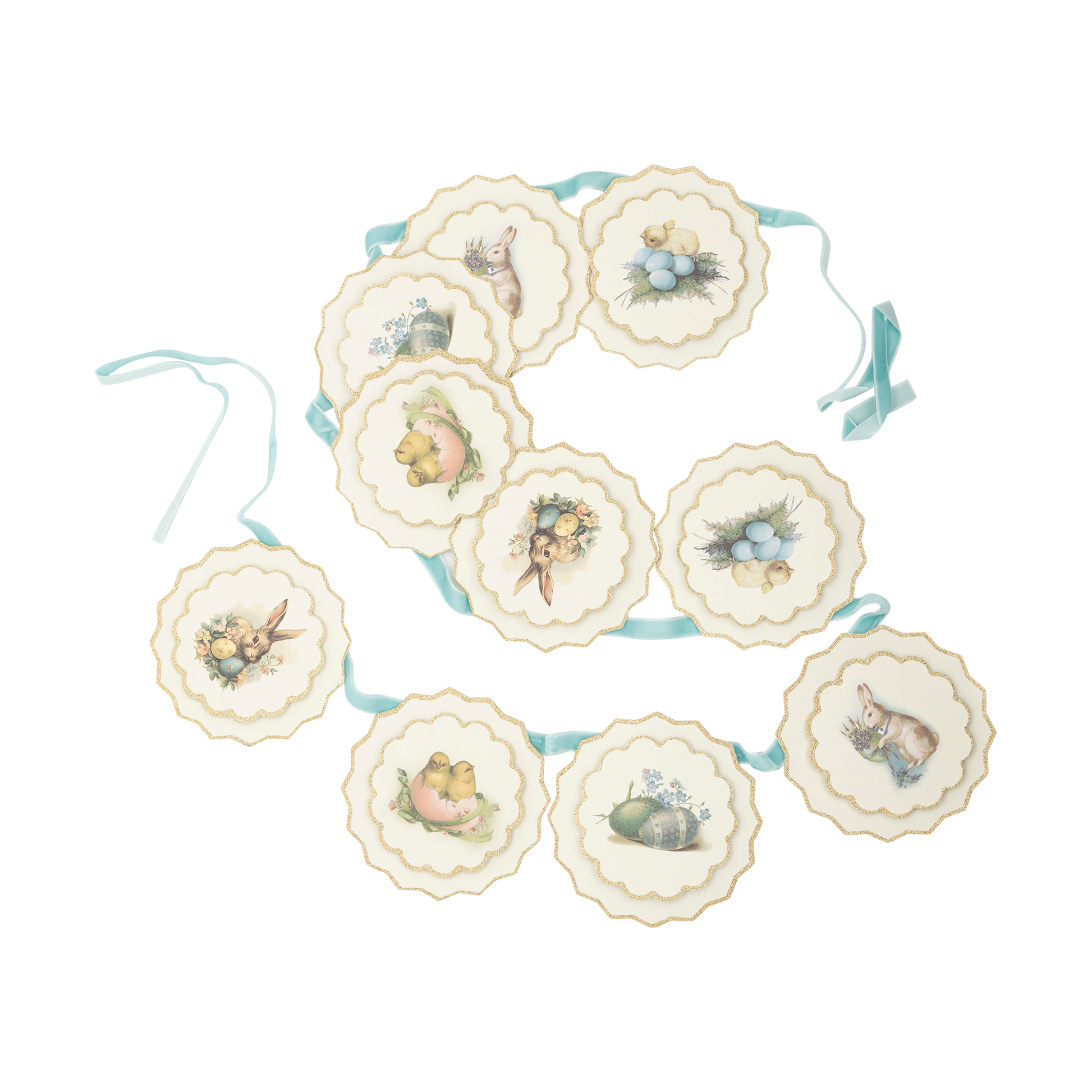 Embrace the trending vintage aesthetic with this enchanting Easter banner! Featuring 12 beautifully layered pieces with on-trend scalloped edges and gold borders showcasing vintage bunnies, birds, and eggs in soft pastels and white. Strung on luxe light blue velvet ribbon with delicate glitter accents, this USA-designed 3-foot garland brings that coveted nostalgic charm to your modern spring celebrations. Pairs perfectly with our Happy Easter glitter banner for a complete vintage-inspired display.