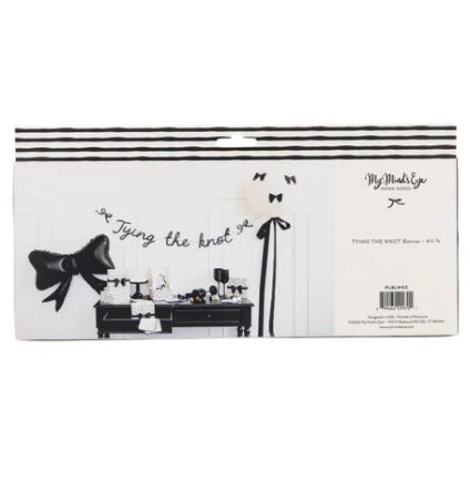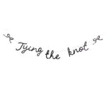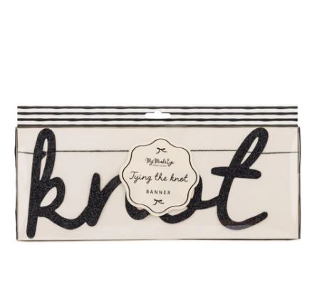 Celebrate the bride-to-be in sophisticated style! This USA-designed banner features elegant cursive lettering spelling "Tying the Knot" in dramatic black glitter, accented with decorative cut-out bows. The flowing script and bow details create a chic focal point for any pre-wedding celebration.